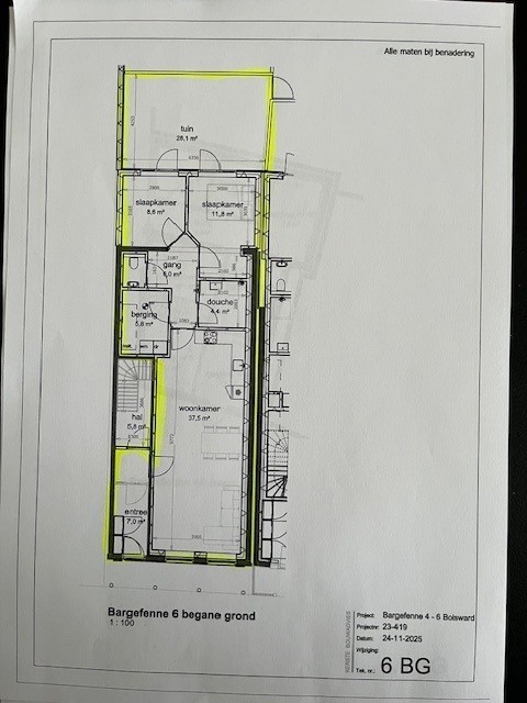 - ( beschikbaar ca. 15 mei 2026 ) Bargefenne 6 (bgg.) -- gezamenlijke entree/ hal ca. 11 m², woonkamer ca. 38 m², 2 slaapkamers ca. 9 en 12 m², inpandige berging voor wasmachine/wasdroger enz. ca. 6 m², badkamer met douche en wastafel ca. 4,5 m², toilet ca. 1,5 m², achtertuin ca. 25 m² en externe berging/fietsenstalling ca. 6 m²,