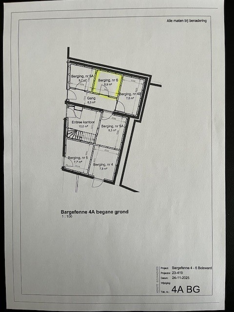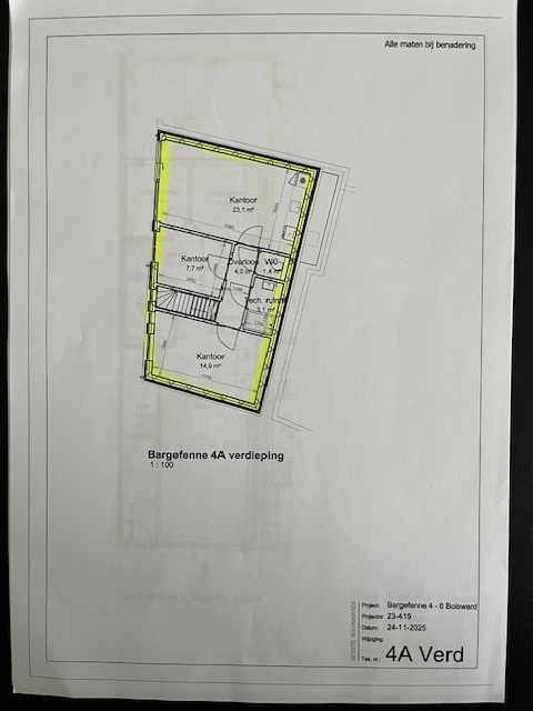 -1 kantoorappartement ( nr. 4 A ) -- entree/voorportaal kantoor met trapopgang ca. 10 m², overloop/gang ca. 4 m², 3x kantoorruimtes ca. 23, 15 en 8 m², toilet ca. 1,5 m² en technische ruimte ca. 3 m² ( oplevering EIND MAART 2026 ).