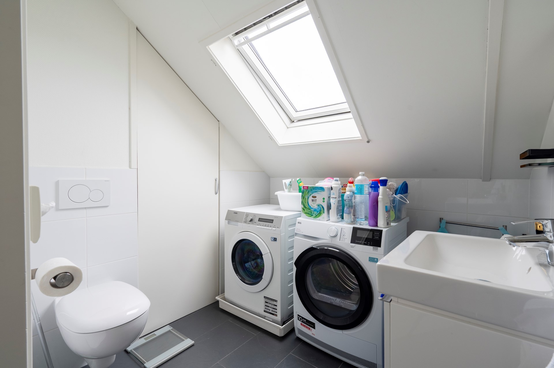 via vaste trap naar 2 slaapkamers met dakvensters en aparte ruimte met 3e hangend toilet, wastafel, 2e wasmachine-aansluiting en dakvenster, aparte bergkast met cv-installatie en mechanisch ventilatiesysteem.